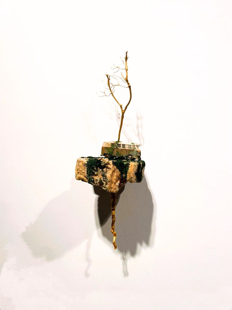 My sculptures and paintings are little familiar objects that weave stories. These small objects act as bearers of hope and bridges making the link between cultures. An empty chair symbolises what we left behind and keeps us connected to our roots. A lonely boat is a bearer of hope. A floating bridge invites us to build connections and empathy towards the unknown."