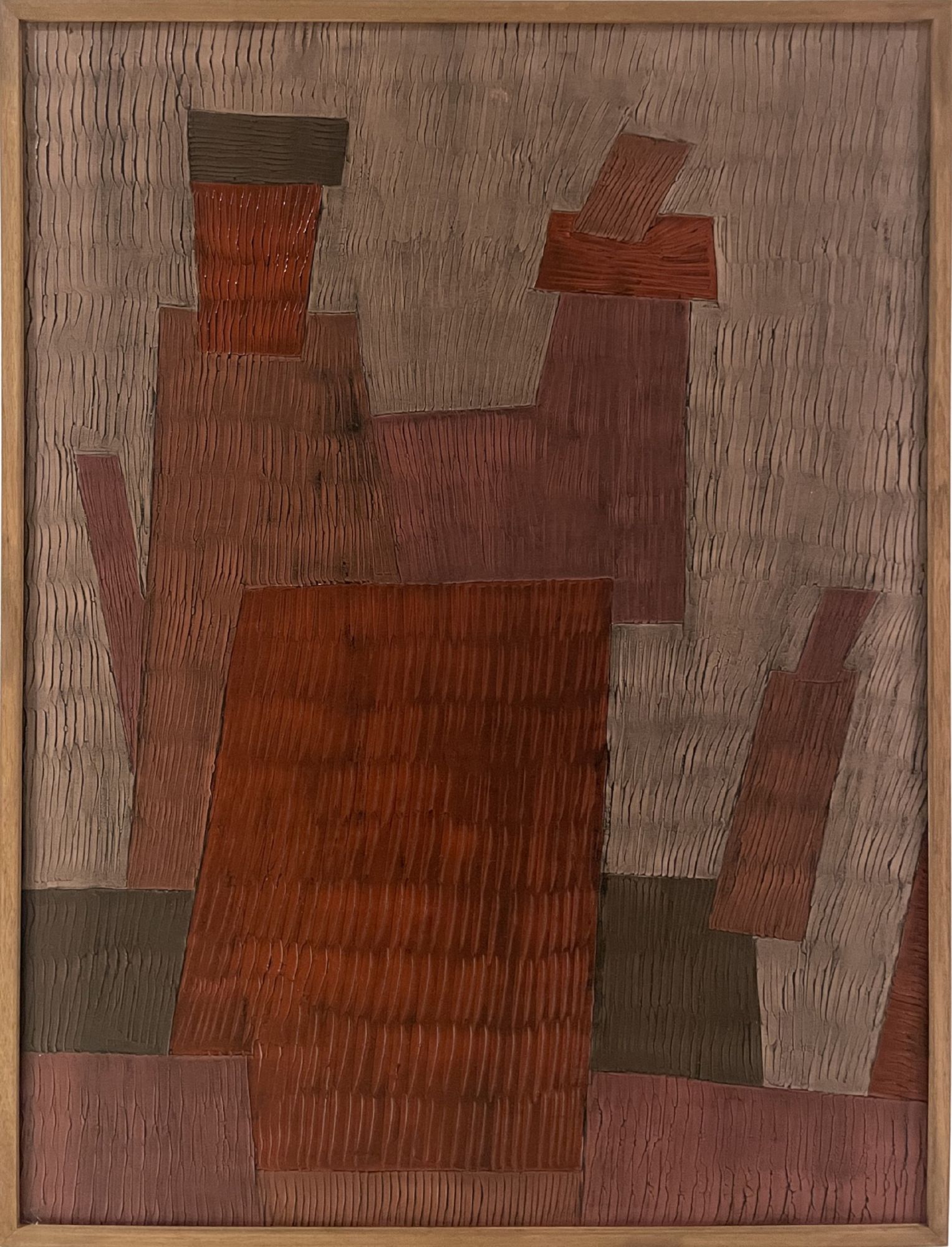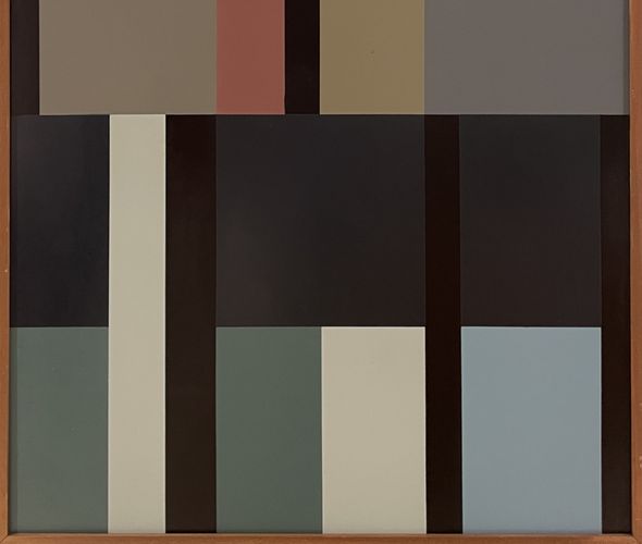 Searching for a new type of painting in the digital era, and questioning the challenges posed by the use of these new media in the creation of art, Idrissi worked for two years with computer engineers to devise an algorithm in which every colour and every form are transcribed in a line of a computer programming. In this way, a khaki green colour is summarised into an online web program, and associated with another line of code which defines its form. By varying the colour formula in a very minimal way (for example by changing only one of the digits that make up a line of the code), the colour is transformed, not in a gradient of the initial colour, but with a different beige-brown colour, while its digital root is related to that of the initial colour. Because of this common root, the resulting image is extremely harmonious, eliciting instant approval from the viewer. At the crossroads between the virtual and the real, this abstract arrangement of forms and colours, created by artificial intelligence, is then transposed on canvas. After numerous experiments with supports and materials, including pastel, oil, acrylic on paper and oil on wood, Idrissi came to the medium of cellulose paint on HDF wood plate, obtained through a mixture of fibers and synthetic resin, as is the case of the present work.
