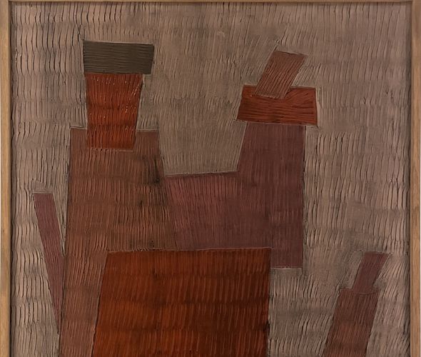 Searching for a new type of painting in the digital era, and questioning the challenges posed by the use of these new media in the creation of art, Idrissi worked for two years with computer engineers to devise an algorithm in which every colour and every form are transcribed in a line of a computer programming. In this way, a khaki green colour is summarised into an online web program, and associated with another line of code which defines its form. By varying the colour formula in a very minimal way (for example by changing only one of the digits that make up a line of the code), the colour is transformed, not in a gradient of the initial colour, but with a different beige-brown colour, while its digital root is related to that of the initial colour. Because of this common root, the resulting image is extremely harmonious, eliciting instant approval from the viewer. At the crossroads between the virtual and the real, this abstract arrangement of forms and colours, created by artificial intelligence, is then transposed on canvas. After numerous experiments with supports and materials, including pastel, oil, acrylic on paper and oil on wood, Idrissi came to the medium of cellulose paint on HDF wood plate, obtained through a mixture of fibers and synthetic resin, as is the case of the present work.