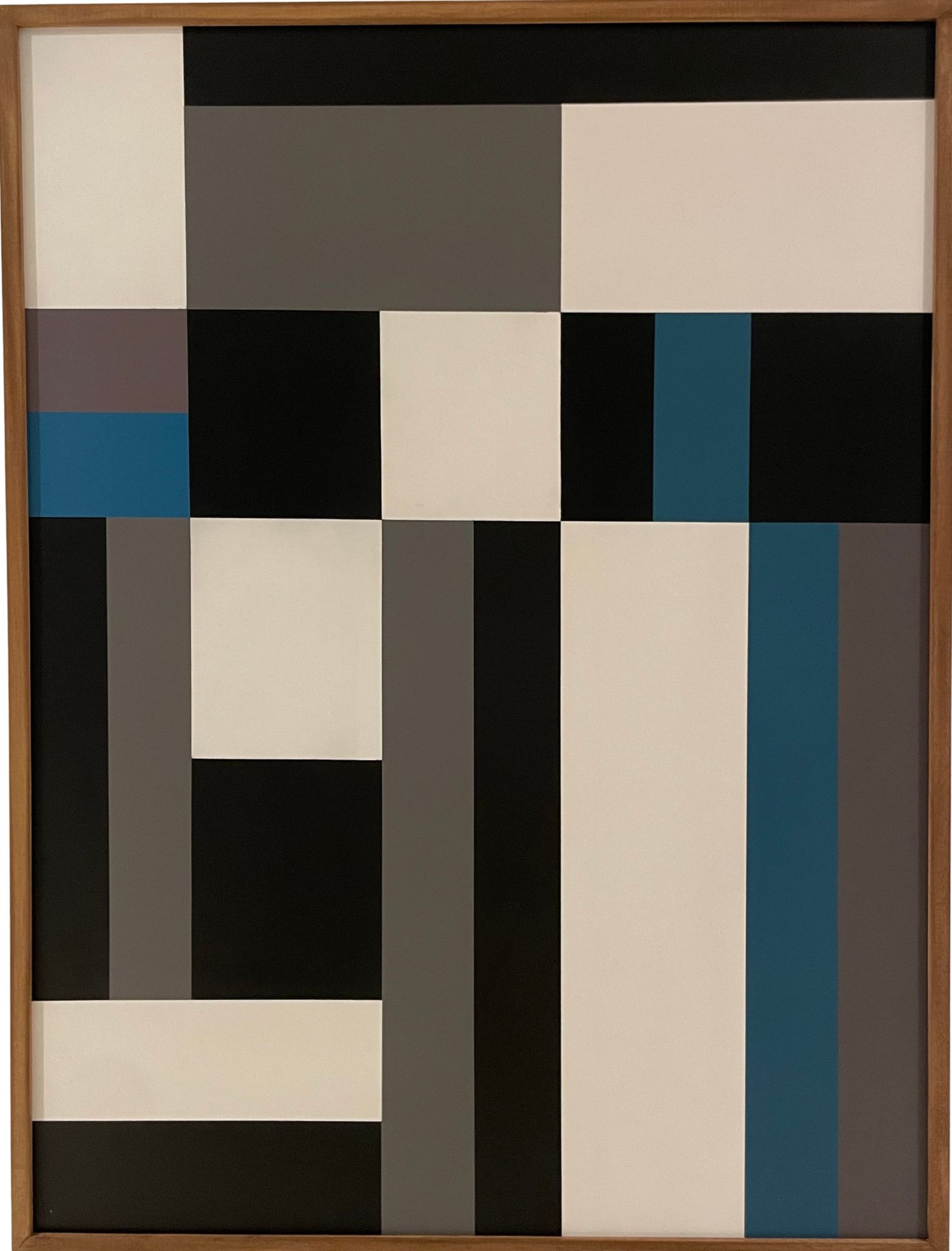 Searching for a new type of painting in the digital era, and questioning the challenges posed by the use of these new media in the creation of art, Idrissi worked for two years with computer engineers to devise an algorithm in which every colour and every form are transcribed in a line of a computer programming. In this way, a khaki green colour is summarised into an online web program, and associated with another line of code which defines its form. By varying the colour formula in a very minimal way (for example by changing only one of the digits that make up a line of the code), the colour is transformed, not in a gradient of the initial colour, but with a different beige-brown colour, while its digital root is related to that of the initial colour. Because of this common root, the resulting image is extremely harmonious, eliciting instant approval from the viewer. At the crossroads between the virtual and the real, this abstract arrangement of forms and colours, created by artificial intelligence, is then transposed on canvas. After numerous experiments with supports and materials, including pastel, oil, acrylic on paper and oil on wood, Idrissi came to the medium of cellulose paint on HDF wood plate, obtained through a mixture of fibers and synthetic resin, as is the case of the present work.