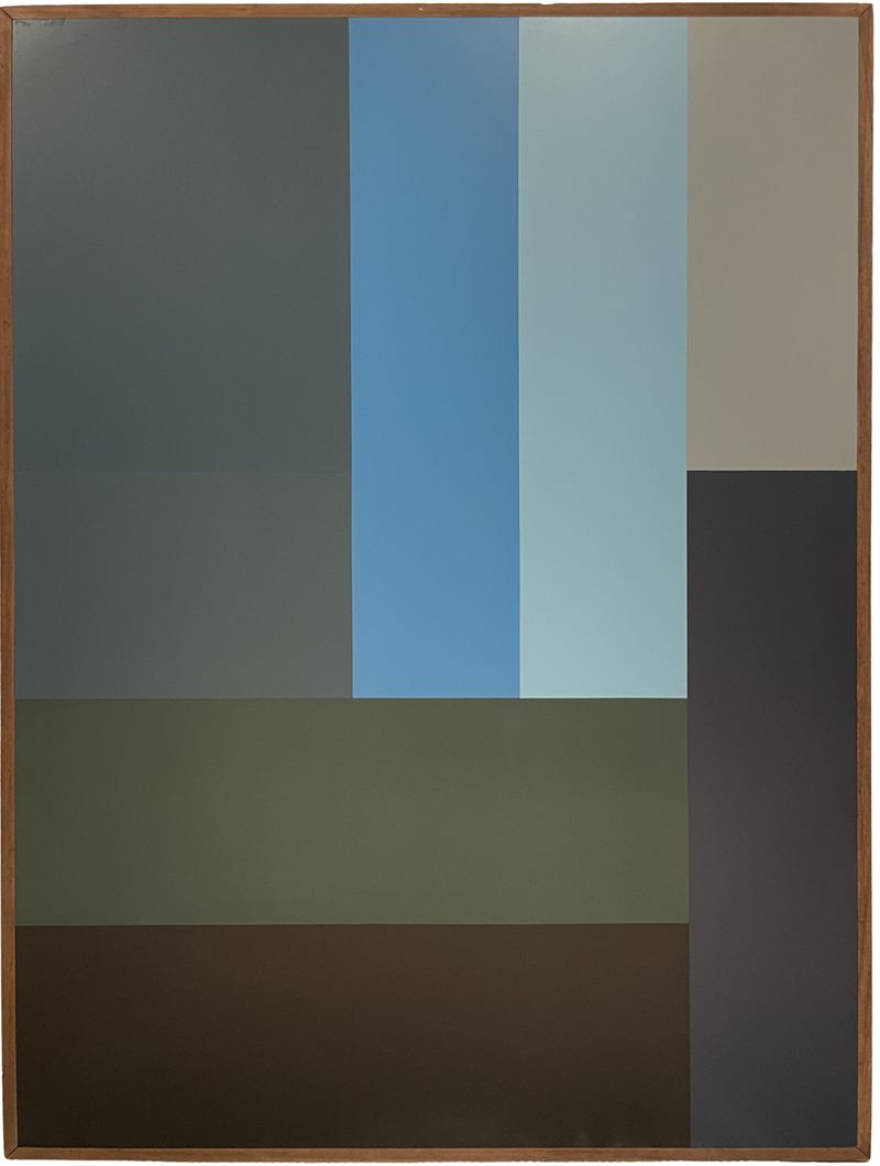 Searching for a new type of painting in the digital era, and questioning the challenges posed by the use of these new media in the creation of art, Idrissi worked for two years with computer engineers to devise an algorithm in which every colour and every form are transcribed in a line of a computer programming. In this way, a khaki green colour is summarised into an online web program, and associated with another line of code which defines its form. By varying the colour formula in a very minimal way (for example by changing only one of the digits that make up a line of the code), the colour is transformed, not in a gradient of the initial colour, but with a different beige-brown colour, while its digital root is related to that of the initial colour. Because of this common root, the resulting image is extremely harmonious, eliciting instant approval from the viewer. At the crossroads between the virtual and the real, this abstract arrangement of forms and colours, created by artificial intelligence, is then transposed on canvas. After numerous experiments with supports and materials, including pastel, oil, acrylic on paper and oil on wood, Idrissi came to the medium of cellulose paint on HDF wood plate, obtained through a mixture of fibers and synthetic resin, as is the case of the present work.