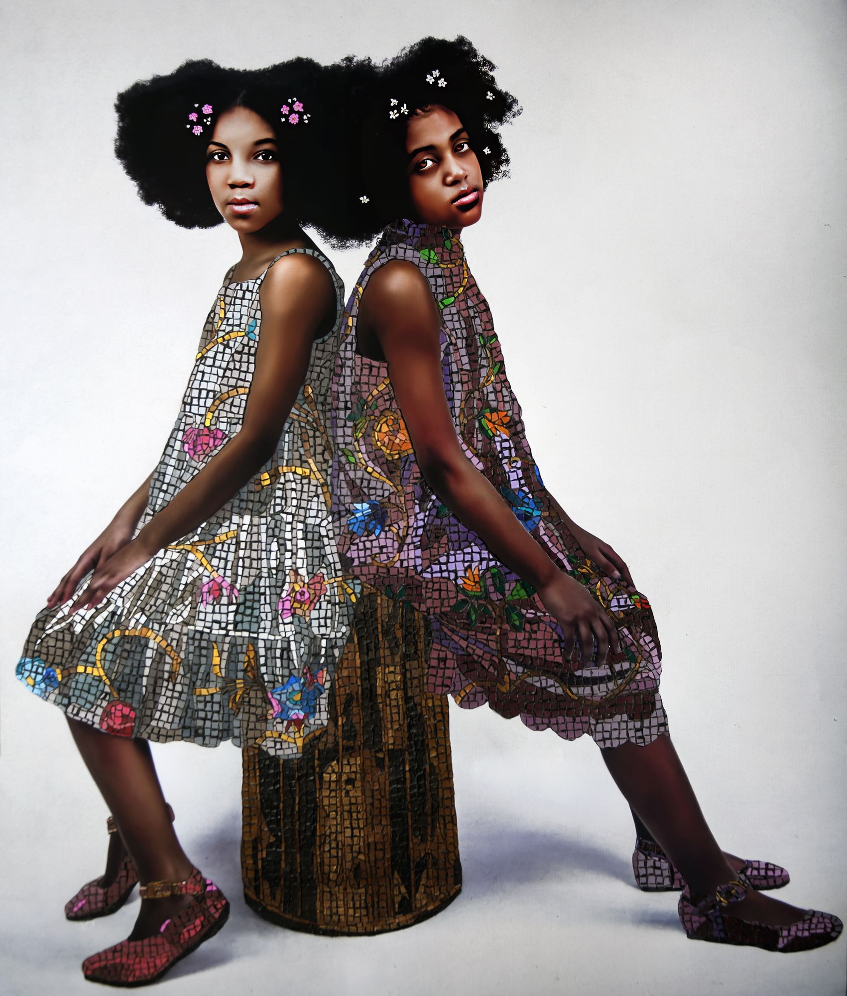 While the camera remains her primary tool of communication, the self-taught artist takes a multi-layered approach in her process. She does not restrict herself to following any set of rules and does not subscribe exclusively to traditional photography practices. Her photographs are often digitally intensified by exaggerating the hairstyles of her subjects (who are often her children and other family members), lending them the eyes of someone older and wiser, and elongating their form, drawing inspiration from the Byzantine period to signify importance. Thereafter, she typically combines overlappings of digital collage and illustration. After refining and printing, she frequently experiments with various art practices by hand-embellishing with acrylic paint, 24-karat gold leaf, and materials such as paper, semi-precious stones, glass, and other mixed media. In choosing to frame the achieved iconography in golden antique, repurposed, and contemporary baroque frames, the artist composes a touching counter-narrative that is more than just a photograph but a new, meaningful compositional expression.